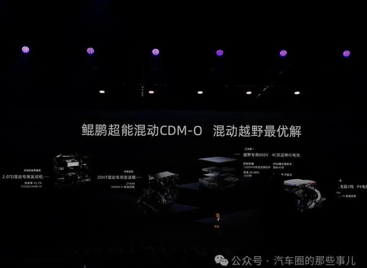 鲲鹏超能混动CDM-O,拥有2.0TD混动专用发动机最大功率155千瓦,最大扭矩340牛·米,热效率45.5%;2挡DHT混动专用变速箱;800V架构,20%-80%充电10分钟;4C双层神行电池,2挡P4电机;智能矢量四电机,最大功率1200千瓦。