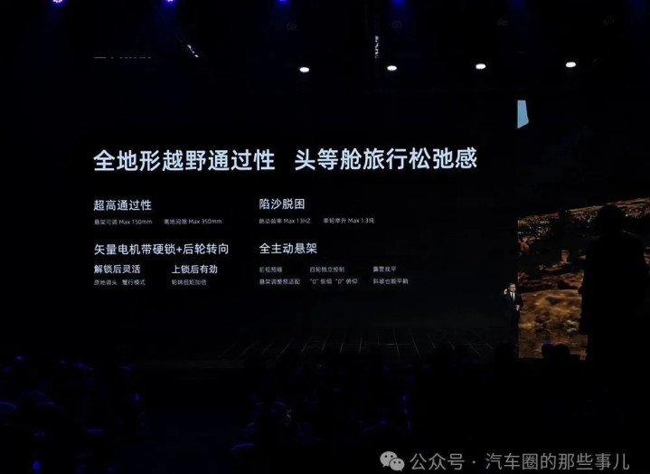 全地形越野最大离地间隙350mm,悬架最大可调150mm;陷沙脱困单轮最大举升1.3吨;在结合矢量电机,后轮转向,可原地调头,蟹行模式,上锁后轮端扭矩加倍;全主动悬架具备前视预瞄,四轮独立控制等。