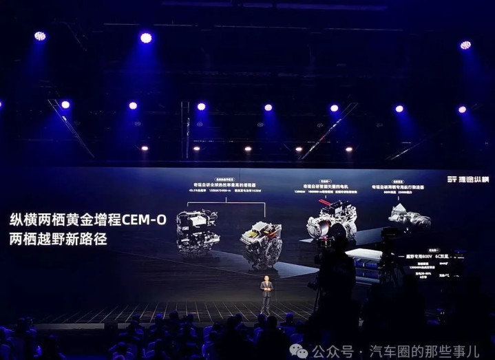 纵横两栖黄金增程CEM-O,同样拥有拥有2.0TD混动增程器,最大功率155千瓦,最大扭矩340牛·米,热效率45.5%;智能矢量四电机,最大功率1200千瓦;800V架构,6C超充双层麒麟电池,20-80%快充6分钟。