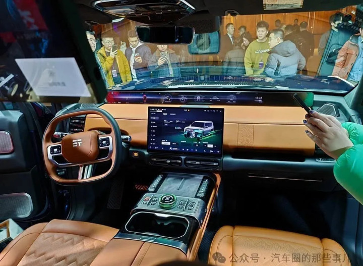 内饰方面,新车配备了双辐平底方向盘和大尺寸中控屏,仪表盘看起来是集成到了上方的一块长条形贯穿屏幕中。车内还能看到裸露的铆钉,展现出硬派越野风格。